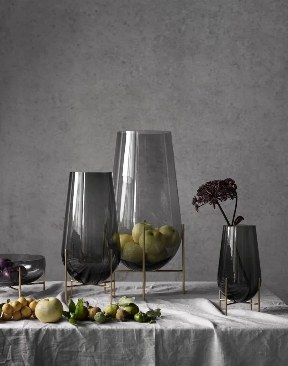 - Material: Hand-blown smoked or clear glass with a slender metal frame.